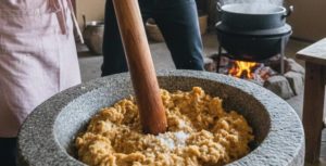 味噌をつくるため、大豆を柔らかくなるまで煮て、塩を加え臼で 搗くこと。米麹や麦麹を加える麹味噌や、麹を使わない豆味噌な ど、つくり方は各地域によって異なる。桶に入れ、熟成させるが仕込んでから三年目くらいが食べ頃となる。