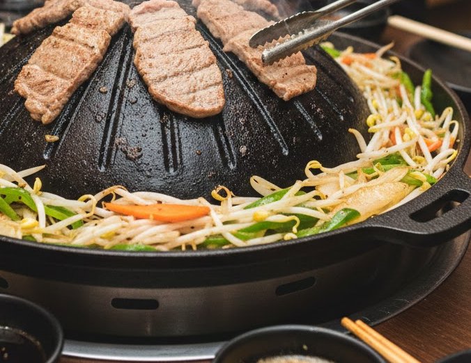 成吉思汗鍋(じんぎすかんなべ) 三冬 季語と歳時記 【子季語】 ジンギスカン鍋/成吉思汗料理 【解説】 羊の肉と野菜を、中央が高くなった、剣道に使う面のような鍋で焼き、たれを付けて食べる。羊の肉を使うことからこの名がつい た。周りに油が飛び散り、煙も出ることから、いまでは夏の観光地の野外での料理として目にすることが多い。