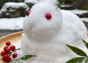 【解説】 盆に雪の塊をのせ、目は南天の実の赤を、耳には南天や笹の葉をつけ兎の形にする。雪達磨とともに子供のころの郷愁を誘う。