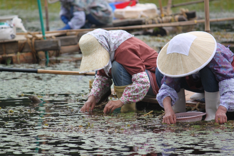 写真は昨日(6月5日) 、新潟県阿賀野市村岡のじゅんさい池で行われた蓴菜採の様子です。ここの蓴菜採は一年に一度、自分たちが食べる分だけを摘み取るというもの。男たちが蓴菜採の筏を作り、女たちが採取します。竹竿を操って筏をゆっくりと慎重に移動させたあと、竿の先端にしつらえた鎌で蓴菜の株を手繰り寄せ、ひとつひとつ気長に摘んでゆきます。