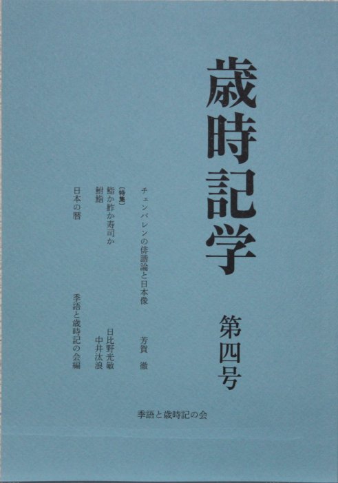 「歳時記学」第4号ができました きごさいBASE 投稿日:2011年12月16日 作成者: dvx223272011年12月16日 「歳時記学」第4号では、徳川時代の文化の高さを評価する東大名誉教授・芳賀徹氏が、明治初年に来日した英国の言語学者バジル・ホール・チェンバレンの近世俳諧観や日本観について論じています。 また「鮨」特集では、名古屋経済大学短期大学部教授の日比野光敏氏が鮨の歴史を総論的にまとめ、近江の「浪の音」酒造当主で俳人の中井汰浪氏が地元名物・鮒鮨について書いています。 このほか季語歳会員によるご当地の鮨紹介なども。来年の「暦」も掲載されています。吟行などにご活用ください。