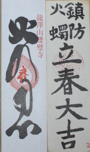 事典によれば禅寺では「立春大吉」と揮毫して門に貼る習慣(とくに曹洞宗)があると知り、坂内文應さん(季語歳・副理事長)の雙璧寺を思い出し、お尋ねしましたら「ありますよ!」のご返事。永平寺の偉いお坊さんの筆の「立春大吉」だそうです。新潟では、新年に檀家さんに年賀として配られて、立春に門前に掲げられます。文應師より一枚お札を頂戴し、私の部屋に貼り春を迎えることにいたしました。聞けば、寺は雪の中。微かな春の兆しを見つけるべく我がアンテナの感度にも心して。