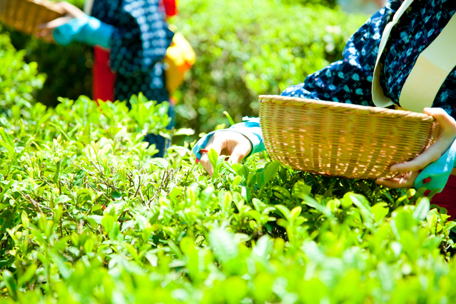 文部省唱歌「夏も近づく八十八夜、♪♪」のメロディーが思い浮かびます。茶畑に昔ながらの赤いたすきにかすり姿の娘たち。八十八夜に摘み取られお茶は極上で、古来より不老長寿の縁起物の新茶として珍重されてきました。(季語歳監事、写真=広島地方での茶摘風景)